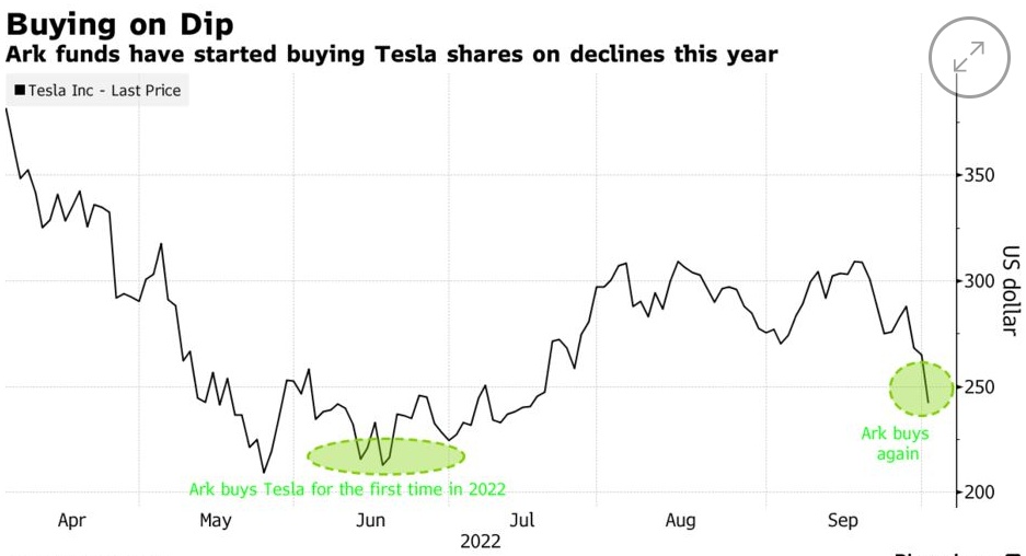 这是伍德在2022年第二次购买特斯拉股份,此前一年她一直在减持特斯拉股份。最新的收购进一步证明,伍德又开始了逢低买进的热潮。