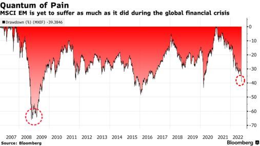 该指数较去年的高点下跌了大约39%,在2008年全球金融危机期间则下跌66%。很多因素表明,这种疲软可能仍会持续一段时间,尤其是美联储持续激进加息,将继续提振美元并导致资金从新兴市场撤出。