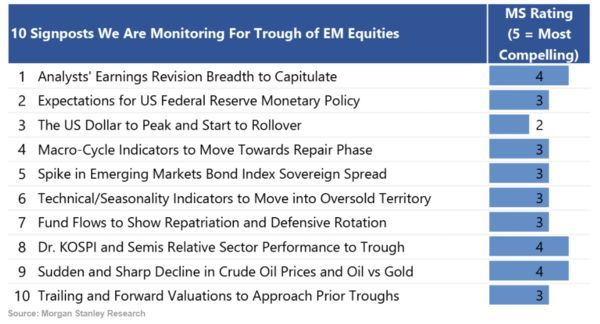 Garner及其同事上个月在一份报告中写道,亚洲和新兴市场股市中的10个熊市将有6个在9月或10月触底。他们正在监测10个信号,包括美元的强势程度、半导体行业的表现以及盈利修正的广度等,以寻找当前周期的低点。