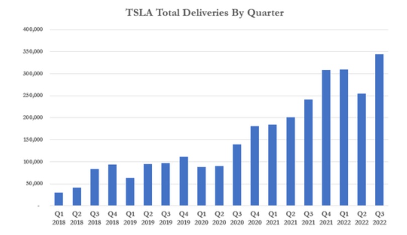 10月2日数据显示,特斯拉三季度交付量为343830辆,虽创纪录新高,但却低于华尔街预期的约35.8万辆。