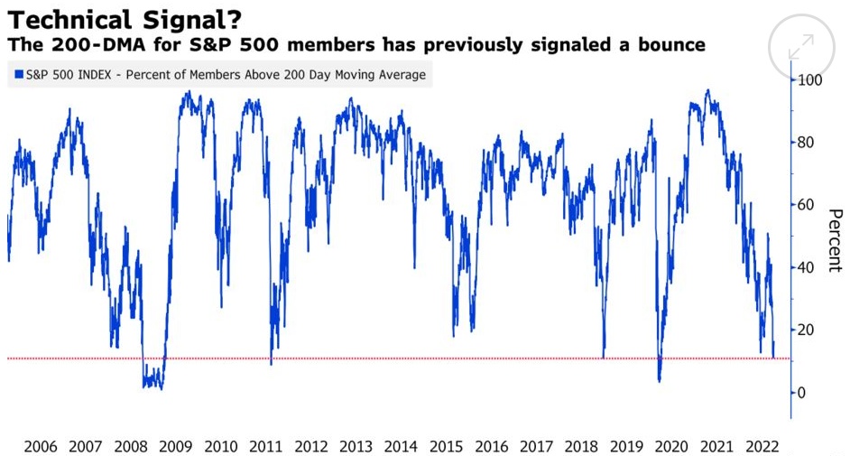 一些技术指标也指向短期反弹,其中一个指标是标普500指数中88%的成分股低于200日移动均线。Garthwaite表示:“100%的情况下,市场都能在这一水平上实现一个月的上涨。”