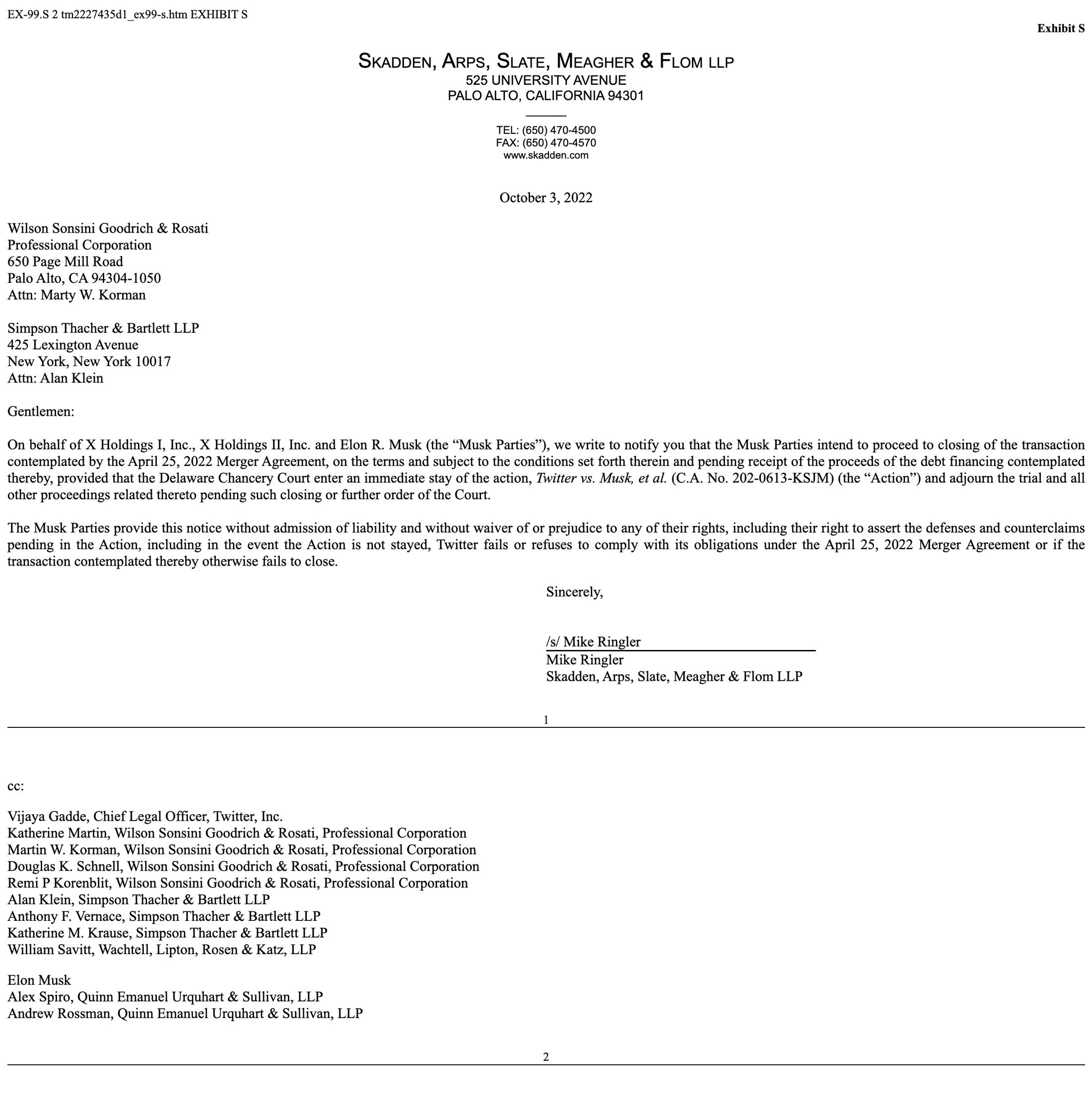 智通财经APP获悉,特斯拉CEO埃隆·马斯克重新提出以每股54.20美元的原报价收购社交媒体巨头推特(TWTR.US),收购价值仍维持在此前的440亿美元,意味着他放弃了为退出交易所做的努力,并有可能避免一场颇具争议的法庭大战。根据提交给美国证券交易委员会(SEC)的一份文件,马斯克在周一给推特的一封信中提出了这一提议,该文件也证实了媒体早些时候的报道。