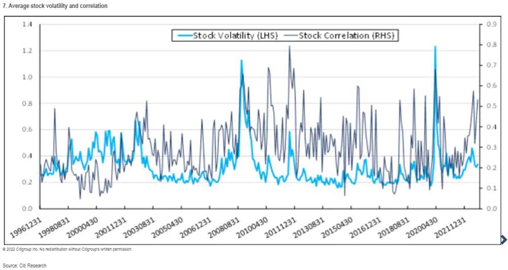 更糟糕的是,根据花旗的这份报告,即将到来的财报季可能无助于提振市场,因为股市相关性已达到疫情开始以来的最高水平。这表明,个别业绩可能会被利率和信贷市场的极端波动淹没。