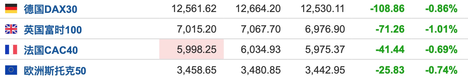 2. 截至发稿,德国DAX指数跌0.86%,英国富时100指数跌1.01%,法国CAC40指数跌0.69%,欧洲斯托克50指数跌0.74%。