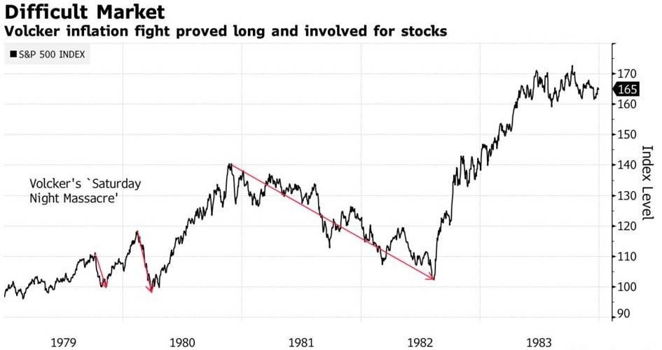 四十多年后的今天,相似之处比比皆是。随着通胀逼近两位数,鲍威尔领导的美联储正在实施自沃尔克时代以来最有力的货币紧缩行动,在股市和债市动荡之际大举加息。历史给市场的启示是发人深省的。当中央银行与市场作对时,复苏需要时间。