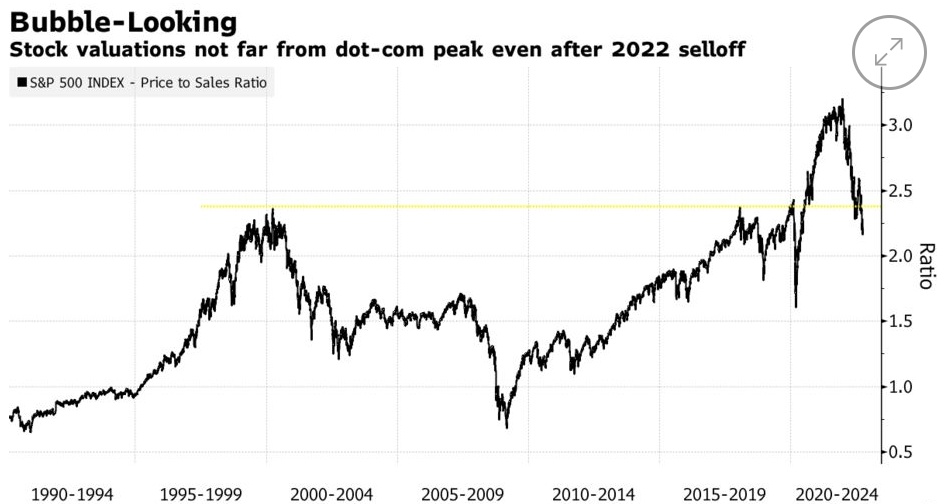以股价与营收之比来衡量,标普500指数的估值虽然已从历史高点回落,但仍处于与1999年互联网泡沫顶峰时差不多的水平。科技股泡沫的破裂再次提醒人们,股市可能需要数年时间才能出现持续反弹——标普500指数曾连续三年出现两位数的百分比跌幅。
