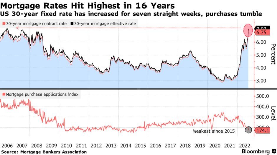 过去七周时间里,美国抵押贷款利率飙升了1.3个百分点,为2003年以来可比时期的最大涨幅。这表明,随着美联储加大紧缩力度抗击通胀,借贷成本随之上升。此外,截至9月30日当周的MBA抵押贷款购买指数环比暴跌12.6%,至174.1,为2015年以来的最低水平。
