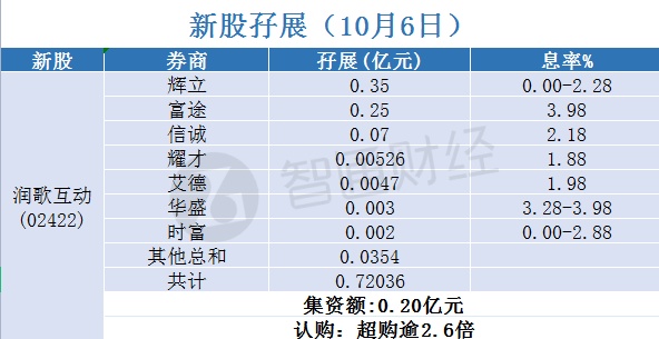 智通财经APP获悉,润歌互动(02422)正在招股中。截至10月6日,辉立、耀才、华盛等合计为润歌互动借出孖展0.72036亿港元,超认购逾2.6倍。