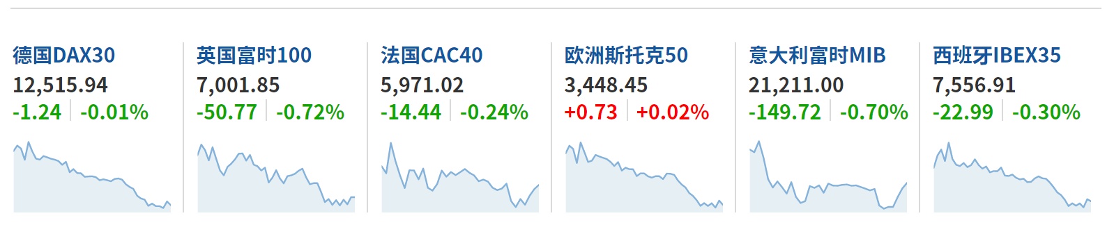 2. 截至发稿,德国DAX指数跌0.01%,英国富时100指数跌0.72%,法国CAC40指数跌0.24%,欧洲斯托克50指数涨0.02%。