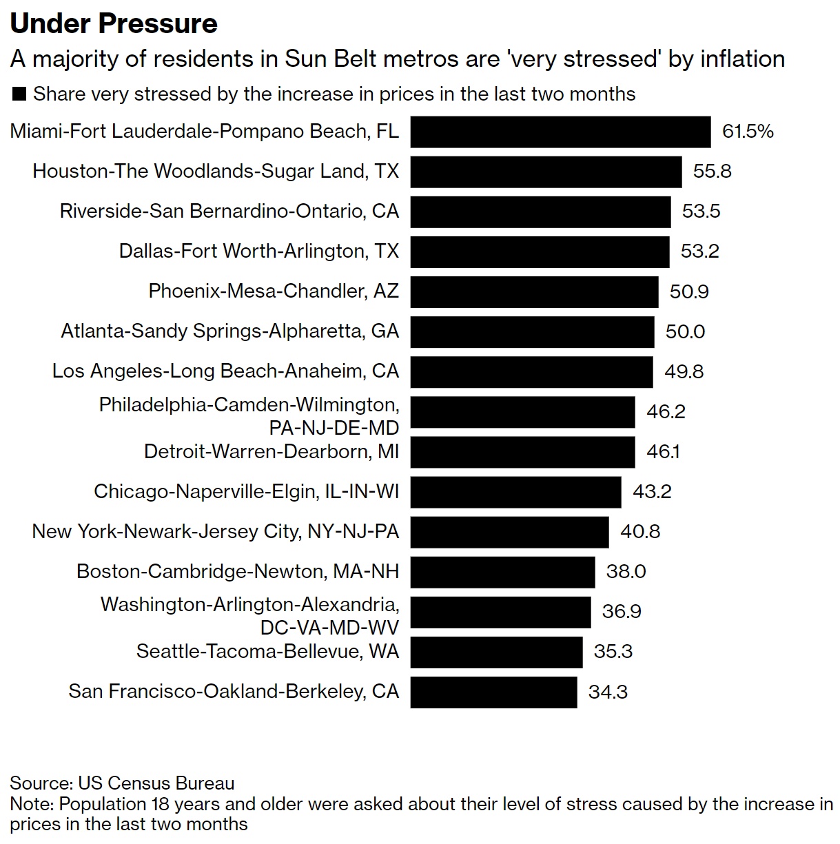美国人口普查局在其定期家庭调查中加入了一个关于物价飙升影响的新问题。结果显示,几乎每个人都至少有一点通货膨胀的压力,尤其是在迈阿密这样的快速增长的城市,那里的生活成本飙升。