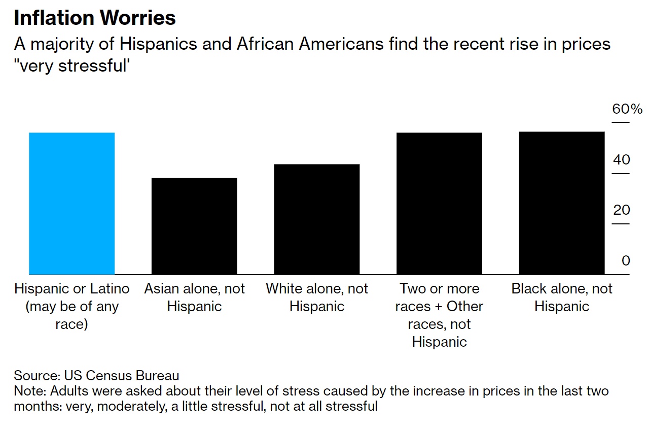该调查还强调了种族之间的差异。超过一半的西班牙裔和黑人受访者认为通货膨胀“压力很大”,相比之下,白人和亚裔的这一比例分别为43%和38%。