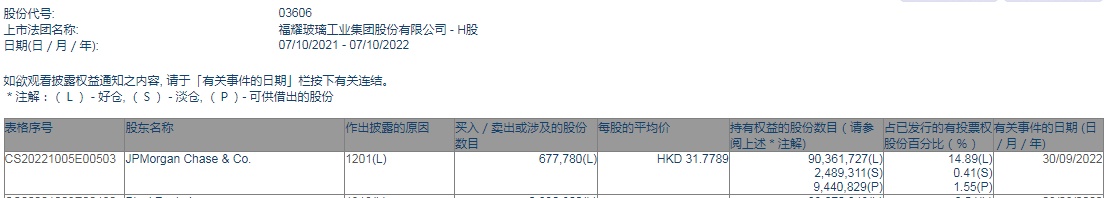 智通财经APP获悉,香港联交所最新资料显示,9月30日,小摩减持福耀玻璃(03606)67.778万股,每股作价31.7789港元,总金额约为2153.91万港元。减持后最新持股数目约为9036.17万股,最新持股比例为14.89%。