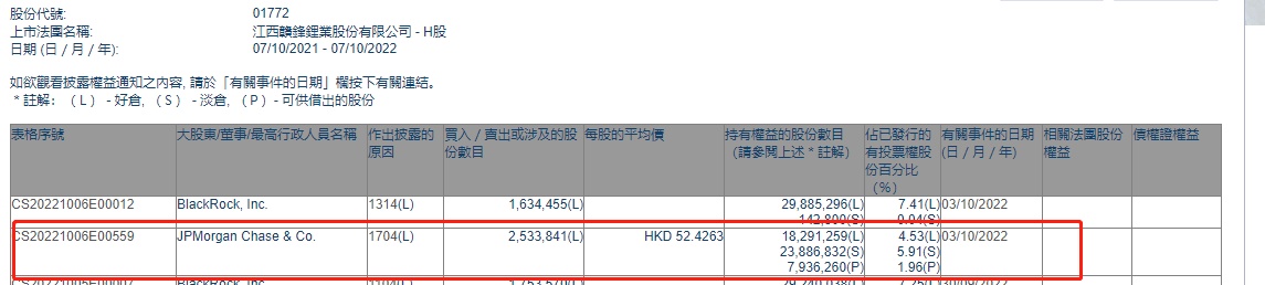 智通财经APP获悉,香港联交所最新资料显示,10月3日,小摩减持赣锋锂业(01772)253.3841万股,每股作价52.4263港元,总金额约为1.33亿港元。减持后最新持股数目约为1829.13万股,最新持股比例为4.53%。