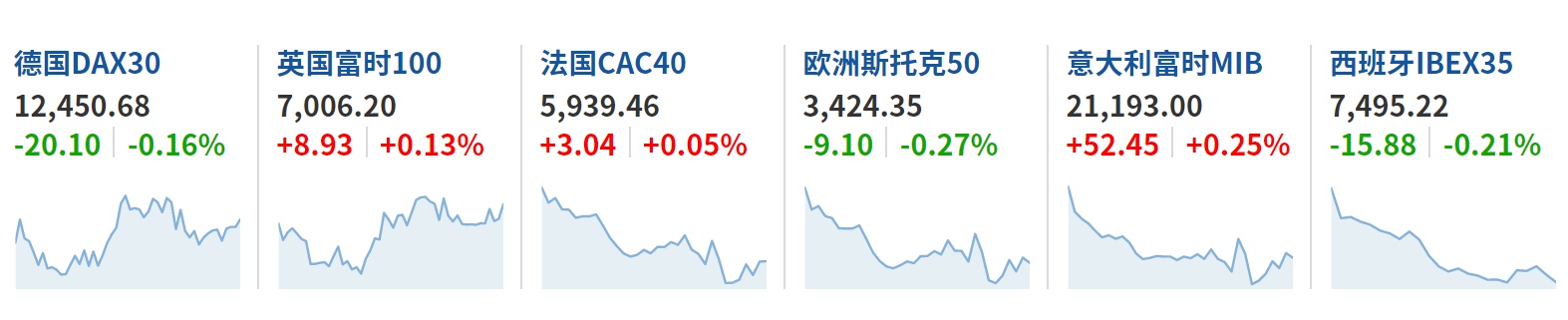 2. 截至发稿,德国DAX指数跌0.16%,英国富时100指数涨0.13%,法国CAC40指数涨0.05%,欧洲斯托克50指数跌0.27%。