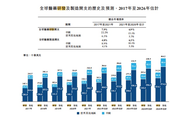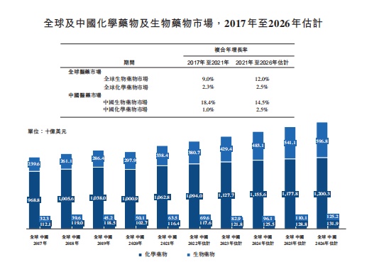 根据弗若斯特沙利文的资料,中国的生物药物市场从2017年的323亿美元稳步增长至2021年的635亿美元,期内复合年增长率为18.4%,预计于2026年将继续增至1,252亿美元,2021年至2026年的复合年增长率为14.5%。
