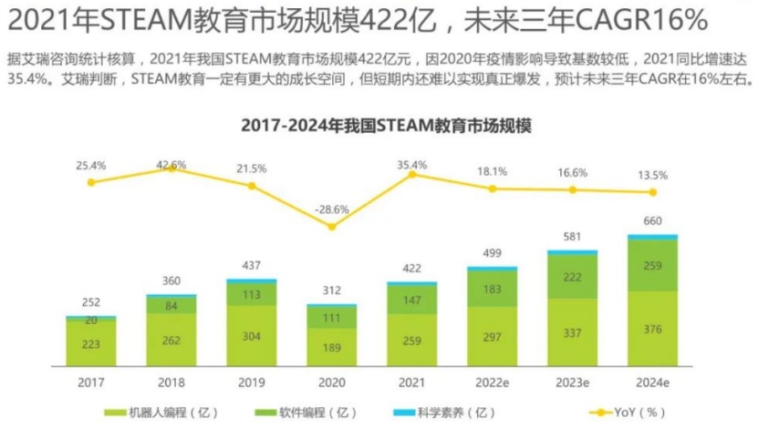 在“双减”政策后,STEAM教育成为了众多K12教培企业的转型方向,在于其在政策端和需求端的双重激励下,市场空间正不断扩容。