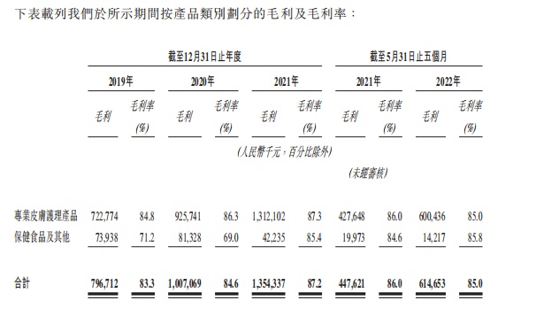 具体到产品,于2019年、2020年、2021年及截至2022年5月31日止五个月,公司专业皮肤护理产品的毛利率保持相对稳定,分别为84.8%、86.3%、87.3%及85.0%。保健食品及其他的毛利率于2019年及2020年保持相对稳定,分别为71.2%及69.0%,随后增至2021年的85.4%,主要由于毛利率相对较低的产品(如饮品及纤维补充剂)销量的减少。保健食品及其他的毛利率于截至2021年及2022年5月31日止五个月保持相对稳定,分别为84.6%及85.8%。