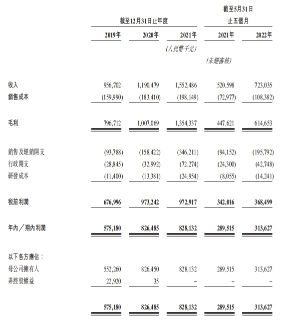 财务方面,巨子生物的收入从2019年的人民币9.57亿元增至2020年的人民币11.91亿元,并进一步增至2021年的人民币15.52亿元,今年1-5月实现营收7.23亿元,较2021年同期增加2.02亿元。