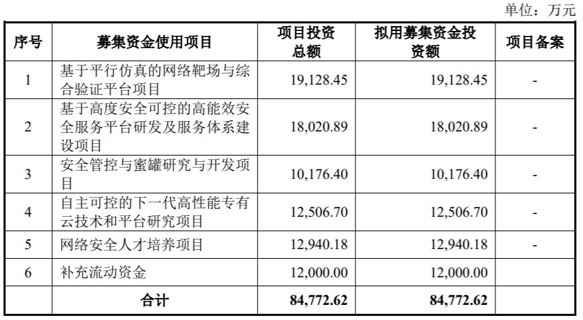 公司本次发行募集资金扣除发行费用后,将按轻重缓急顺序投资于:基于平行仿真的网络靶场与综合验证平台项目、基于高度安全可控的高能效安全服务平台研发及服务体系建设项目、安全管控与蜜罐研究与开发项目、自主可控的下一代高性能专有云技术和平台研究项目、网络安全人才培养项目及补充流动资金。