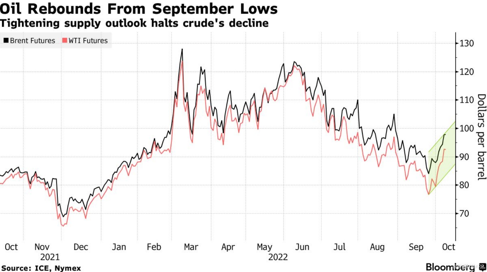 智通财经APP获悉,油价在实现3月以来最大单周涨幅后企稳,因为交易商在能源需求风险与OPEC+决定减产之间进行权衡。目前WTI原油期货价格维持在每桶92美元上方。上周,在OPEC+同意减产200万桶/天之后,WTI原油飙升17%。