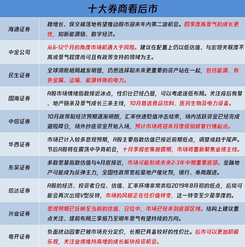 中信证券认为,当前市场底部特征显现,预计将迎来月度级别修复行情起点。海通证券认为,股市迎来年内第二波机会,四季度高景气的成长更优,如新能源链、数字经济。