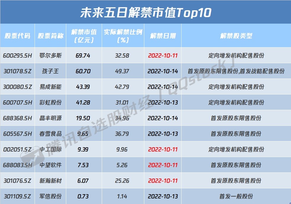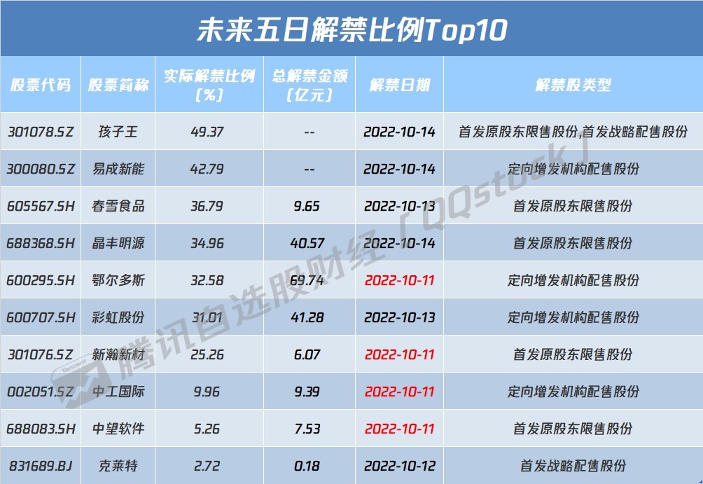 从解禁比例来看,未来五日孩子王解禁比例达49.37%,其次解禁比例居前的分别为易成新能和春雪食品;从解禁市值来看,鄂尔多斯、孩子王、易成新能等股解禁市值居前。