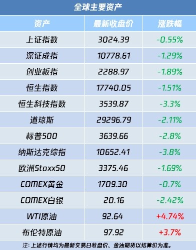 1、美股市场:美股周五收盘重挫,主要股指连续第三个交易日下跌,纳指下跌3.8%。美国9月非农就业数据超预期、失业率持续下降,令市场预测美联储11月加息75个基点的可能性提高,并担心美联储的激进加息政策将使美国经济陷入四年来的第二次衰退。