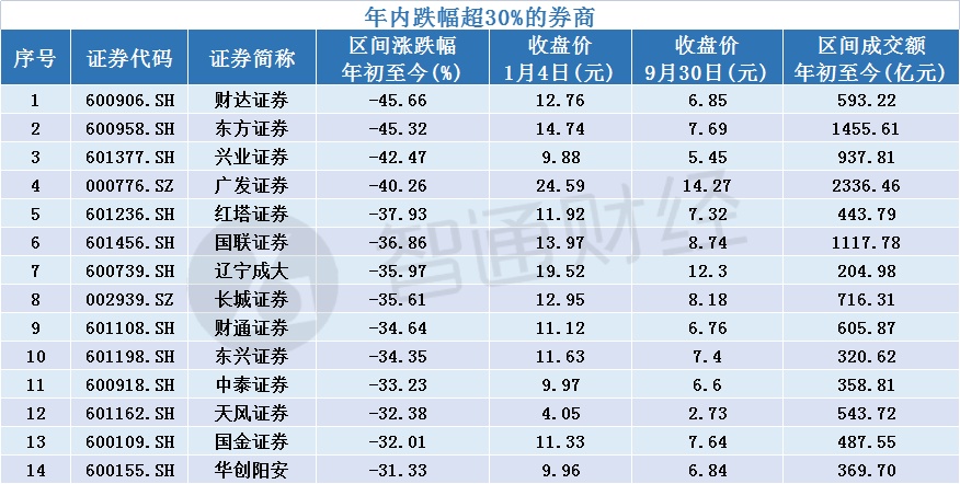 超三成券商股年内跌超30%