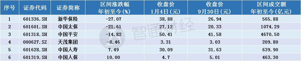 6只保险股中,新华保险、中国太保跌超20%,中国人寿、中国人保年内股价录得正增长。