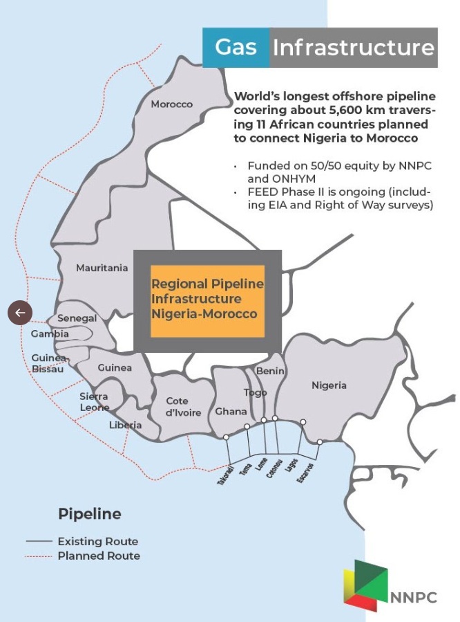 智通财经APP获悉,尼日利亚国家石油公司(NNPC)和摩洛哥国家碳氢化合物及矿业办公室于上个月签署了一份谅解备忘录,使得酝酿已久的项目向现实迈进了一步。这条管道是NNPC正在推动的两项计划之一,俄乌冲突升级后,欧洲对天然气需求激增,且正开辟新的天然气进口渠道,这在一定程度上促使计划进度加快。尼日利亚国有石油公司负责人表示,将于明年就一条价值250亿美元的从尼日利亚至摩洛哥的天然气管道做出投资决定,该管道届时可向欧洲供应燃料。