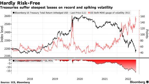 彭博美债总回报指数今年下跌了约13%,几乎是2009年的四倍,是该指数1973年推出以来的最差情况。
