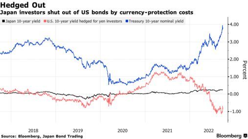 高得惊人的对冲成本将日本的大型养老金和人寿保险公司排除在美债市场之外。尽管名义利率已飙升至4%以上,但对于日本买家而言,美国10年期国债的收益率已跌至负值区域,因为它们要为消除收益中的货币波动而支付成本。