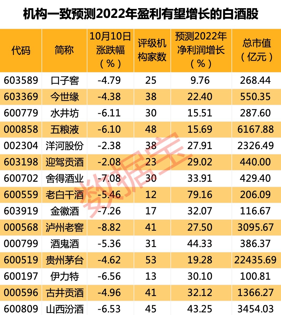 另据数据宝统计,根据3家以上机构一致预测,15家白酒企业有望实现2022年全年归母净利润增长,老白干酒、酒鬼酒、山西汾酒等预测净利润增长率在40%以上。