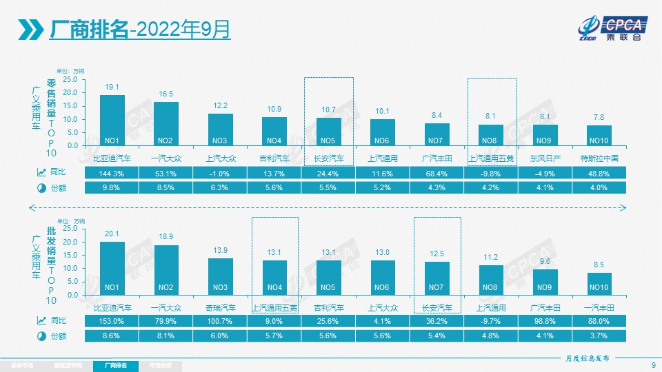 9月自主品牌零售89万辆,同比增28%,环比增5%。9月自主品牌国内零售份额为47.0%,同比增长2.7个百分点;1-9月累计份额47.0%,相对于2021年同期增长7.5个百分点。9月自主品牌批发市场份额50.4%,较去年同期份额增加2.6个百分点;1-9月自主品牌累计份额48.0%,相对于2021年同期增加5.3个百分点。自主品牌在新能源市场获得明显增量,头部企业表现优异,比亚迪汽车、长安汽车、奇瑞汽车、吉利汽车等传统车企品牌份额提升明显。