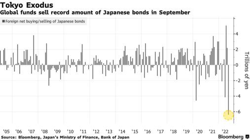 智通财经APP获悉,由于全球主要央行争相加息以对抗通胀,全球债券市场出现了暴跌,外国投资者上个月抛售的日本债券数量创历史新高。根据日本财务省的初步数据,海外基金在9月抛售了6.39万亿日元(439亿美元)的日本债券。由于全球债市抛售推高了收益率,10年期日本国债收益率攀升至日本央行曲线控制范围的上限,刺激了日本央行的额外购买。