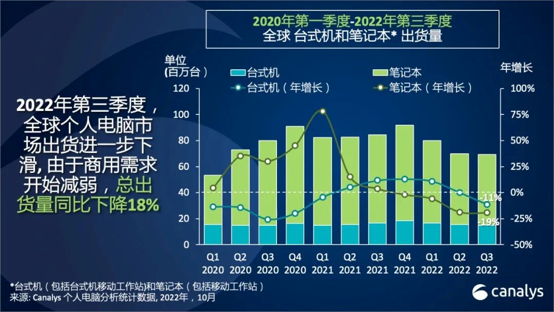 智通财经APP获悉,10月11日, Canalys发布数据显示,全球个人电脑市场在2022年第三季度遭遇需求大幅下滑。企业在IT方面的支出更为谨慎,消费领域和教育市场的疲软现状加剧,台式机和笔记本电脑的总出货量下降18%至6940万。不利的宏观经济和行业因素,包括高通胀、利率上升和渠道库存庞大,削弱了个人电脑市场的势头,并可能持续到2023年。笔记本电脑出货量受影响最大,同比下降19%至5470万台。由于对消费者支出的依赖程度较小,台式机出货量相对稳定,总计为1470万台,同比下降11%。