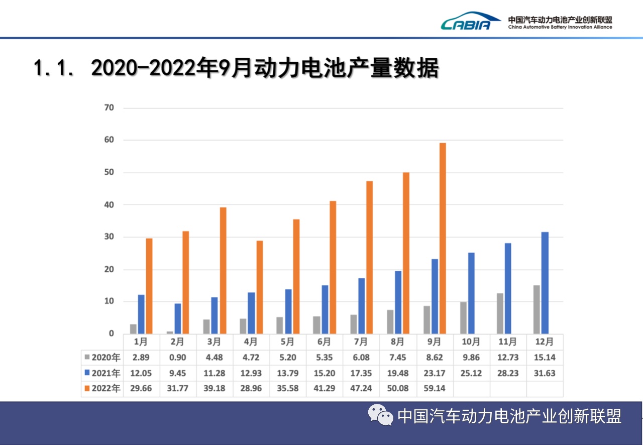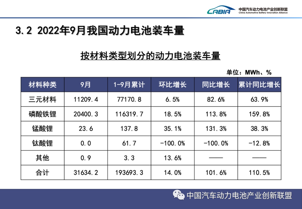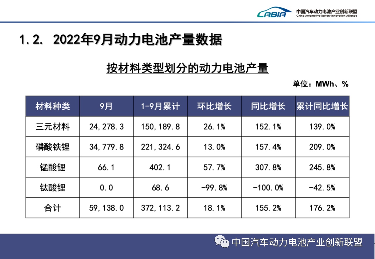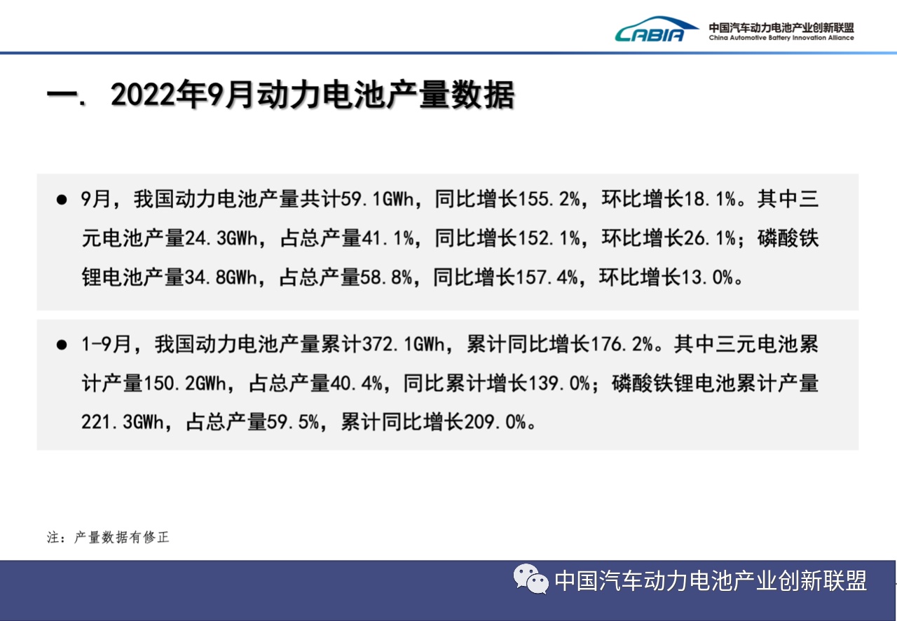 智通财经APP获悉,10月11日,中国汽车动力电池产业创新联盟2022年9月动力电池月度数据显示,9月,我国动力电池产量共计59.1GWh,同比增长155.2%,环比增长18.1%。其中三元电池产量24.3GWh,占总产量41.1%,同比增长152.1%,环比增长26.1%;磷酸铁锂电池产量34.8GWh,占总产量58.8%,同比增长157.4%,环比增长13.0%。1-9月,我国动力电池产量累计372.1GWh,累计同比增长176.2%。其中三元电池累计产量150.2GWh,占总产量40.4%,同比累计增长139.0%;磷酸铁锂电池累计产量221.3GWh,占总产量59.5%,累计同比增长209.0%。