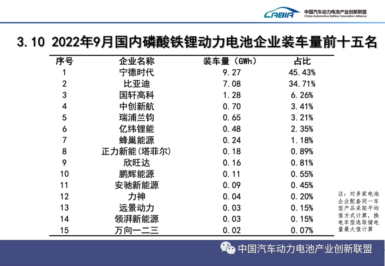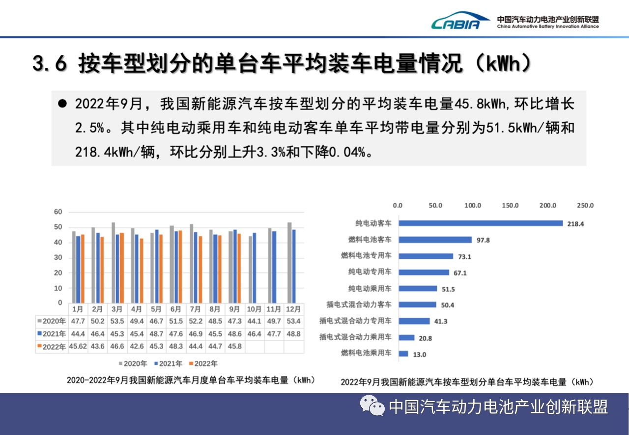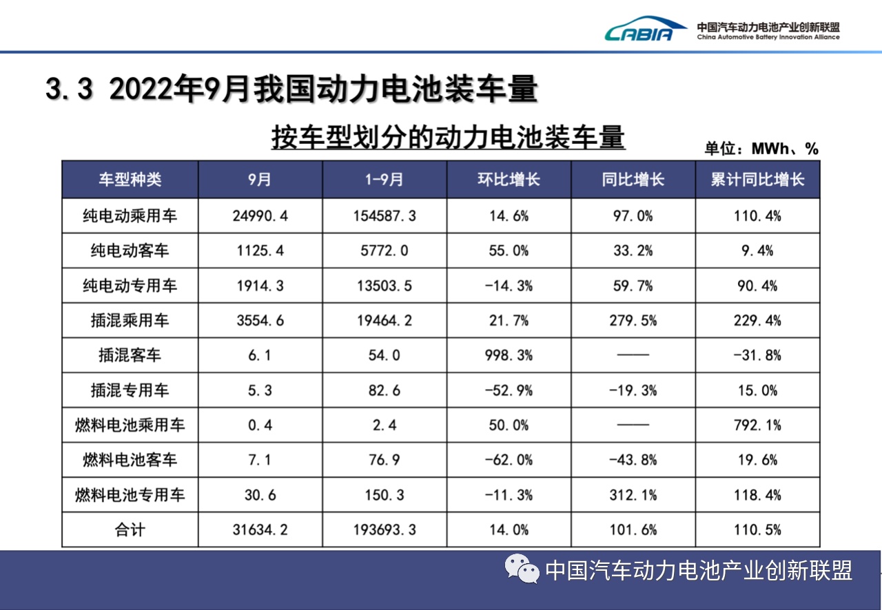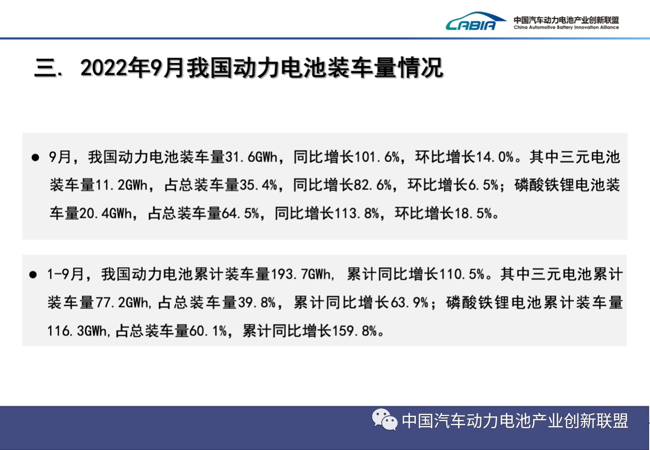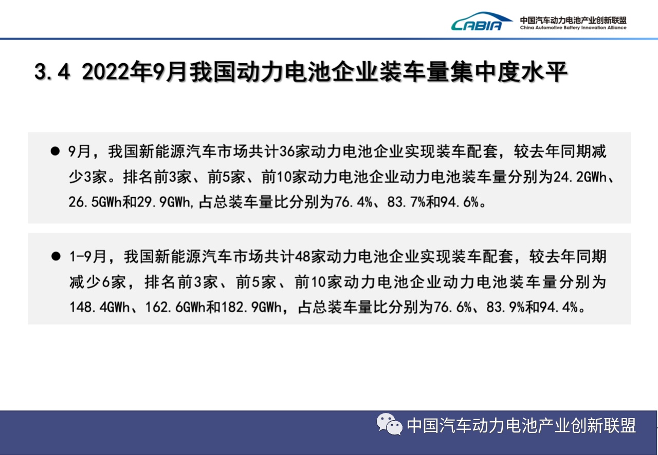 装车量方面:9月,我国动力电池装车量31.6GWh,同比增长101.6%,环比增长14.0%。其中三元电池装车量11.2GWh,占总装车量35.4%,同比增长82.6%,环比增长6.5%;磷酸铁锂电池装车量20.4GWh,占总装车量64.5%,同比增长113.8%,环比增长18.5%。1-9月,我国动力电池累计装车量193.7GWh,累计同比增长110.5%。其中三元电池累计装车量77.2GWh,占总装车量39.8%,累计同比增长63.9%;磷酸铁锂电池累计装车量116.3GWh,占总装车量60.1%,累计同比增长159.8%。9月,我国新能源汽车市场共计36家动力电池企业实现装车配套,较去年同期减少3家。排名前3家、前5家、前10家动力电池企业动力电池装车量分别为24.2GWh、26.5GWh和29.9GWh,占总装车量比分别为76.4%、83.7%和94.6%。1-9月,我国新能源汽车市场共计48家动力电池企业实现装车配套,较去年同期减少6家,排名前3家、前5家、前10家动力电池企业动力电池装车量分别为148.4GWh、162.6GWh和182.9GWh,占总装车量比分别为76.6%、83.9%和94.4%。
