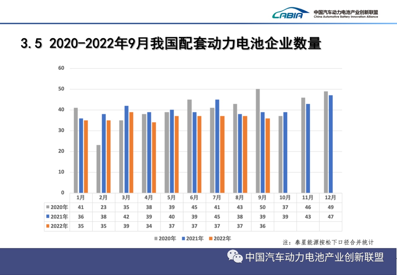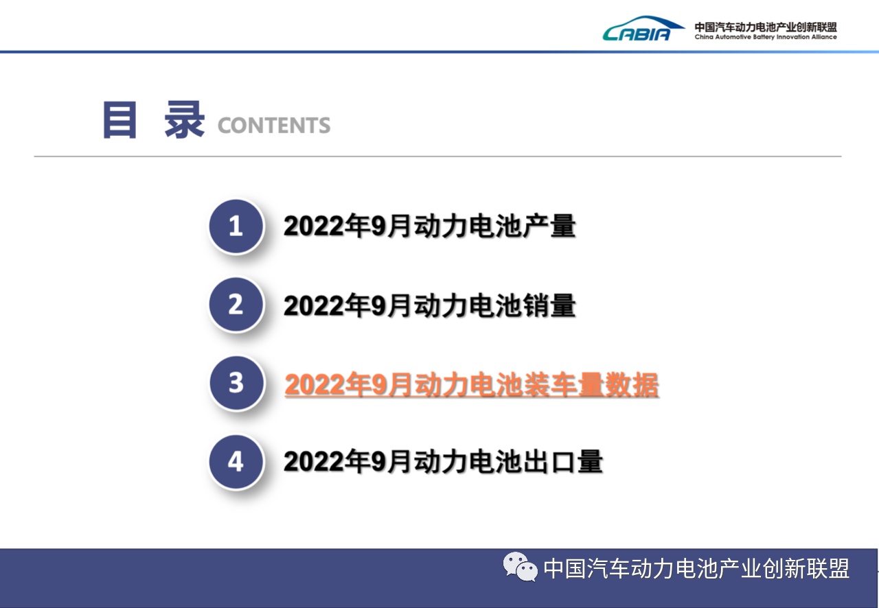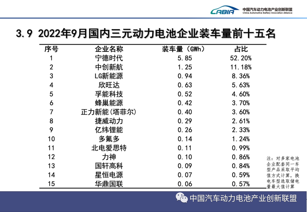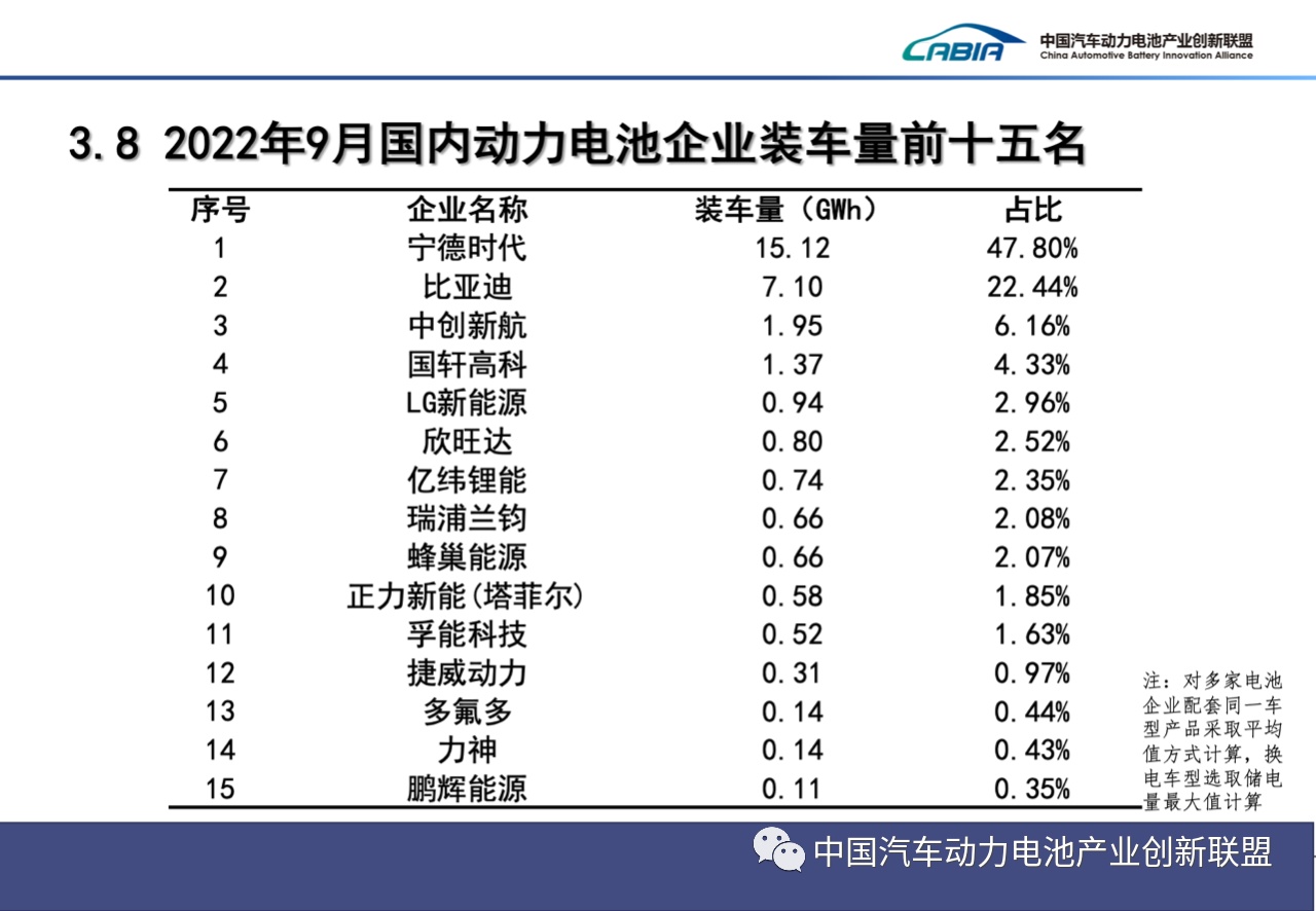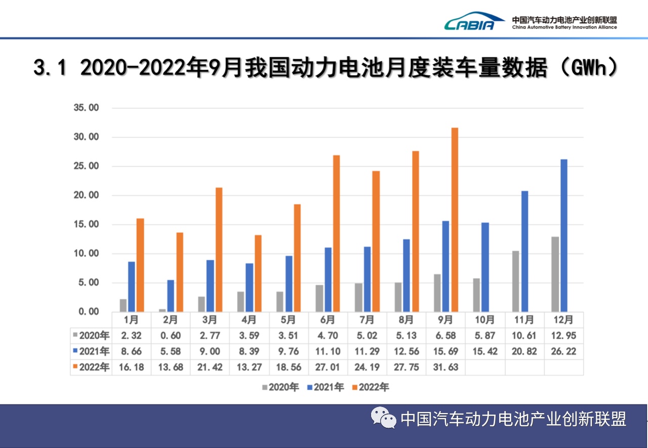 装车量方面:9月,我国动力电池装车量31.6GWh,同比增长101.6%,环比增长14.0%。其中三元电池装车量11.2GWh,占总装车量35.4%,同比增长82.6%,环比增长6.5%;磷酸铁锂电池装车量20.4GWh,占总装车量64.5%,同比增长113.8%,环比增长18.5%。1-9月,我国动力电池累计装车量193.7GWh,累计同比增长110.5%。其中三元电池累计装车量77.2GWh,占总装车量39.8%,累计同比增长63.9%;磷酸铁锂电池累计装车量116.3GWh,占总装车量60.1%,累计同比增长159.8%。9月,我国新能源汽车市场共计36家动力电池企业实现装车配套,较去年同期减少3家。排名前3家、前5家、前10家动力电池企业动力电池装车量分别为24.2GWh、26.5GWh和29.9GWh,占总装车量比分别为76.4%、83.7%和94.6%。1-9月,我国新能源汽车市场共计48家动力电池企业实现装车配套,较去年同期减少6家,排名前3家、前5家、前10家动力电池企业动力电池装车量分别为148.4GWh、162.6GWh和182.9GWh,占总装车量比分别为76.6%、83.9%和94.4%。