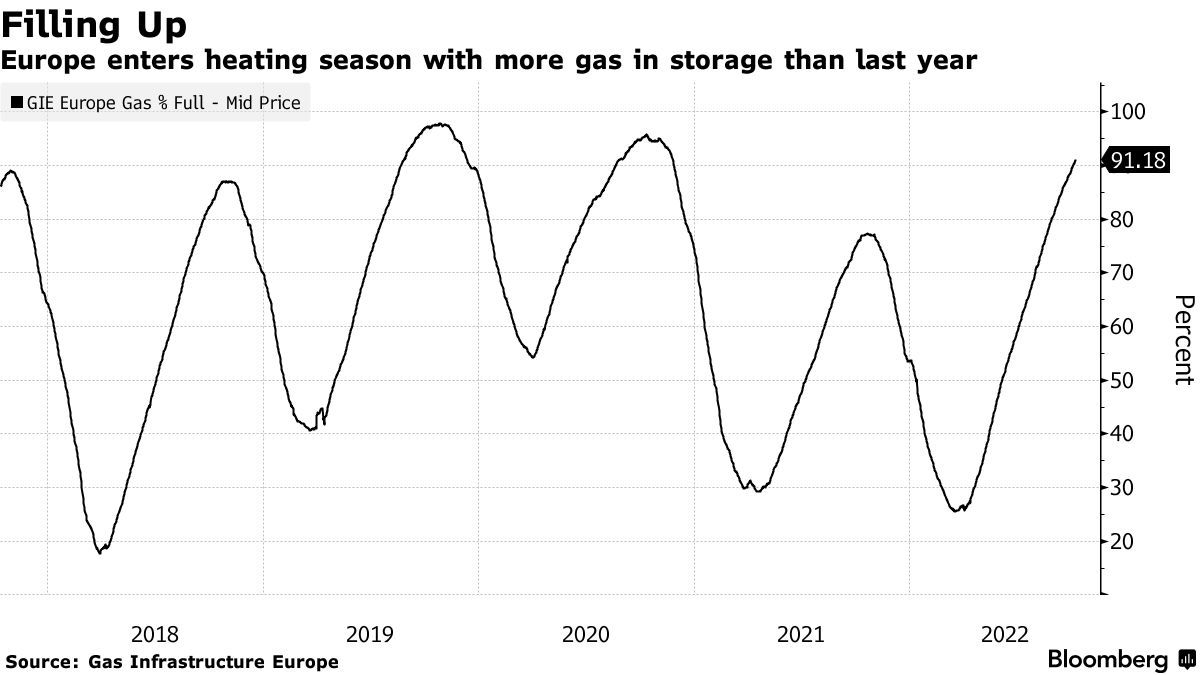 欧洲进入供暖季节,储存的天然气比去年更多