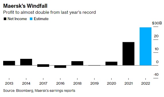 因此,该公司的收益可能会像坐过山车一样。彭博社的最新调查显示,马士基今年的净利润将比2021年已经很高的水平几乎翻一番,达到创纪录的293亿美元。这将使它成为斯托克欧洲600指数中利润第三高的股票。