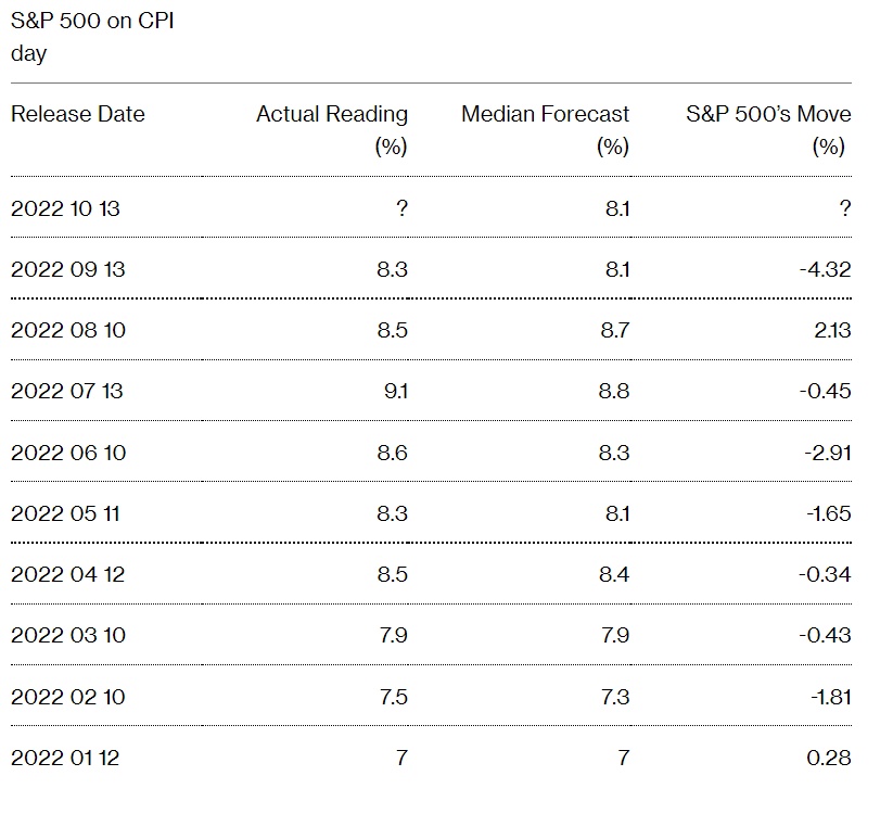 在上周的最新非农就业报告出炉后,美联储官员似乎不再考虑“鸽派”的货币政策立场,在周四公布美国9月消费者价格指数(CPI)之前(北京时间周四20:30),美股市场的短线投机者面临的风险越来越大。来自摩根大通的统计数据显示,高于8.3%的CPI同比数据都将给股市带来巨大威胁,目前最新数据显示市场对于9月CPI同比增长率的普遍预期为8.1%。
