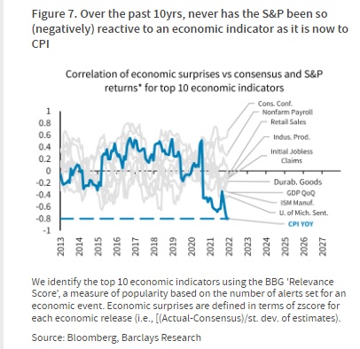 毋庸置疑的是,通胀数据正对美股产生至关重要的影响。包括Anshul Gupta以及Stefano Pascale在内的巴克莱银行策略师们将标普500指数的表现与月度就业人数和季度国内生产总值(GDP)等十大经济指标进行对比之后,发现在过去10年里,美股对一项经济指标的反应从未像如今对CPI数据这样消极。