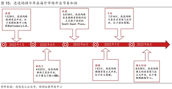 今年上半年,泡泡玛特加快海外布局,将海外销售策略由ToB模式转向DTC主导,加快了直营店的布局速度,分别于英国、新西兰、美国、日本、韩国、澳大利亚核心商圈开设门店。截至今年上半年,公司在港澳台地区及海外门店达24家,预计到年底将达42家。