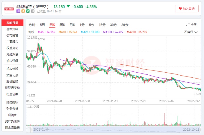 10月11日,被称为中国“盲盒第一股”的泡泡玛特(09992)股价又创历史新低,一度跌至13.06港元/股,跌5.67%,截至收盘报收13.18港元/股,最新市值仅181.96亿港元。