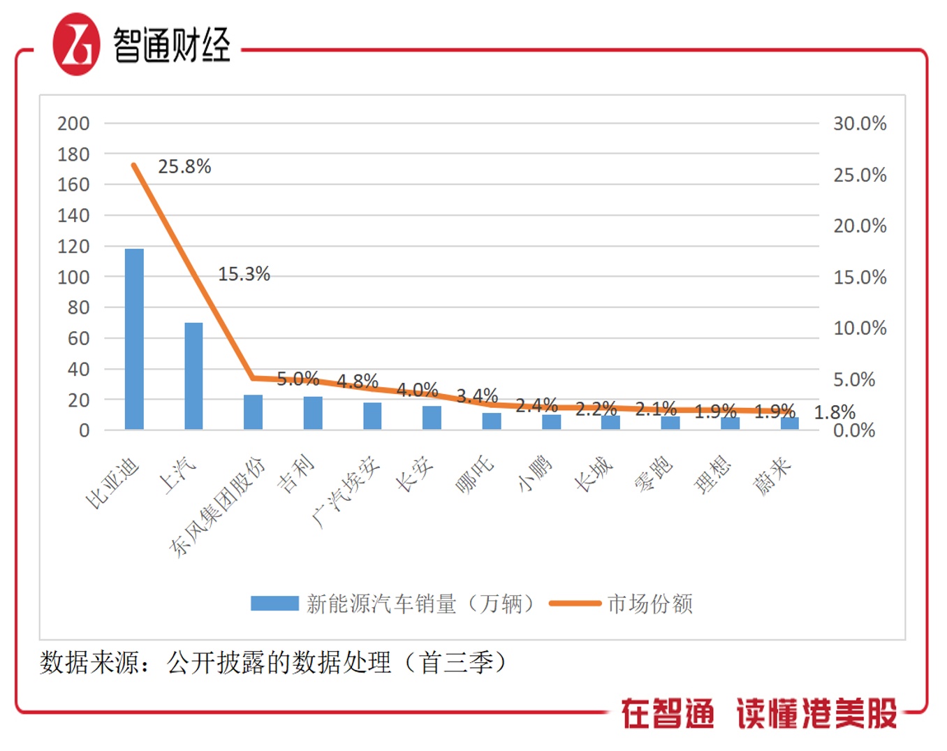 智通财经APP了解到,于9月、Q3及首三季,比亚迪销量分别为20.1万辆、53.87万辆及118.51万辆,同比增长均翻倍,在自主品牌中处于领先地位,同时也在新能源车中,按上述周期市场份额依次为28.4%、27.4%及25.84%,始终保持行业龙头地位。值得注意的是,可以看到传统车企包括上汽、吉利(00175)和广汽(02238)都在加大渗透,首三季上汽新能源车销量近70万辆,而其余两家均也超过了20万辆。