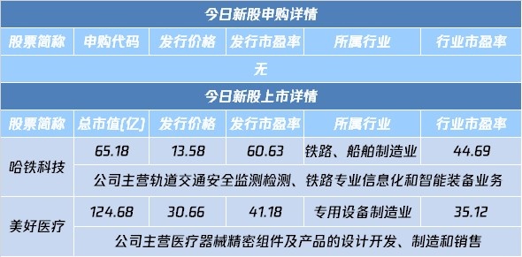 自选哥提示,今日无新股申购,哈铁科技、美好医疗2只新股今日上市。