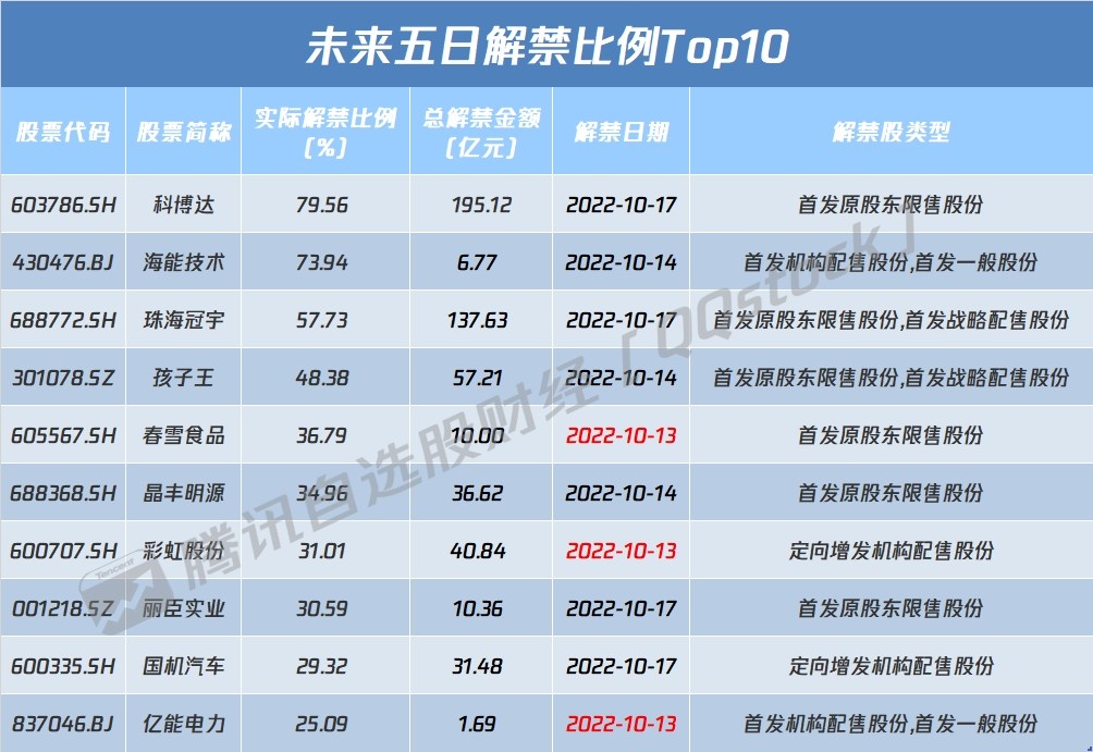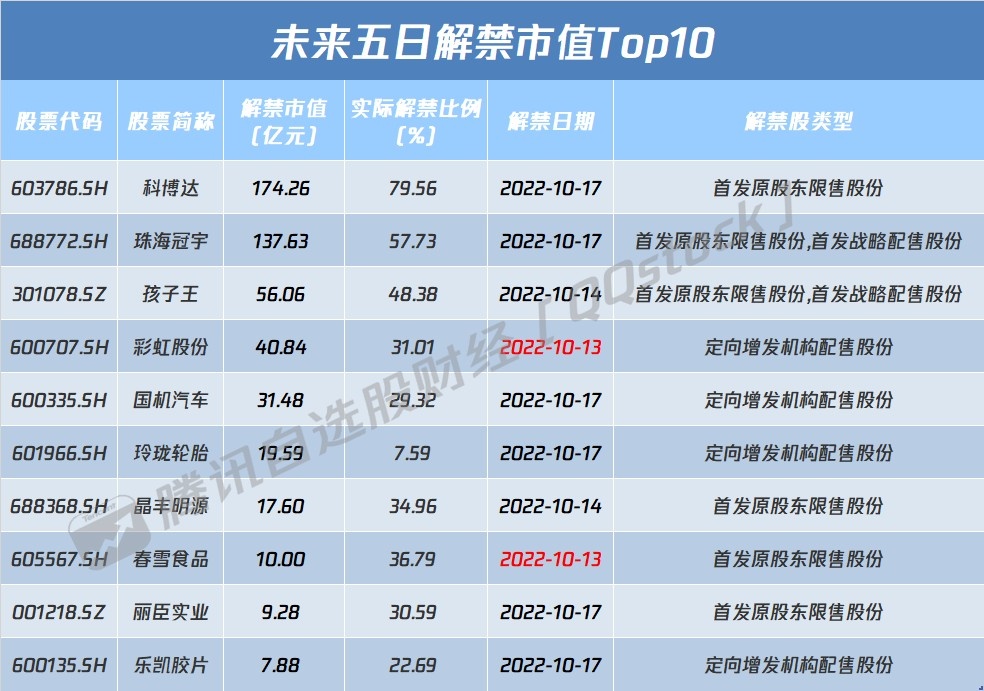 1、孩子王:约5.2638亿股限售股10月14日解禁,占公司总股本48.38%。