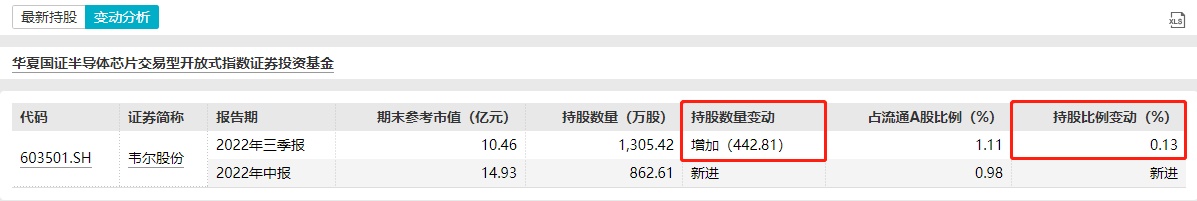 值得注意的是,华夏基金赵宗庭管理的华夏国证半导体芯片ETF也在三季度大幅增持韦尔股份。该基金增持韦尔股份442.81万股,持股比例变动为0.13%,增持后持有该股1305.42万股,占总流通股本持股比例1.11%,位列第八大股东。
