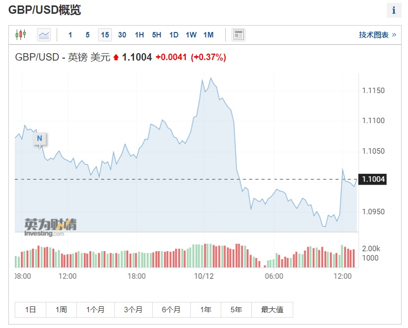 不过,事情似乎出现了变化。周三,有媒体援引知情人士透露的消息称,英国央行曾私下向银行家暗示,如果市场条件需要,可能将购债计划延长至10月14日(原定结束日期)之后。受此消息推动,在伦敦早盘交易中,英镑兑美元汇率扭转此前高达0.4%的跌幅。截至发稿,英镑兑美元汇率涨0.37%,站上1.10关口。